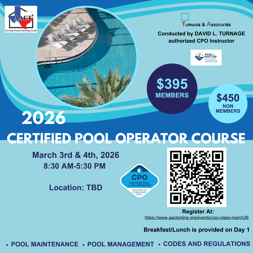Did you know, that in Texas, all public swimming pools and spas have to be under the supervision and direction of a properly trained and certified operator? (The Operator does not have to be on-site when the pool/spa is open. The operator can be responsible for multiple pools/spas at multiple locations. The operator's name and contact information must be available on-site.)