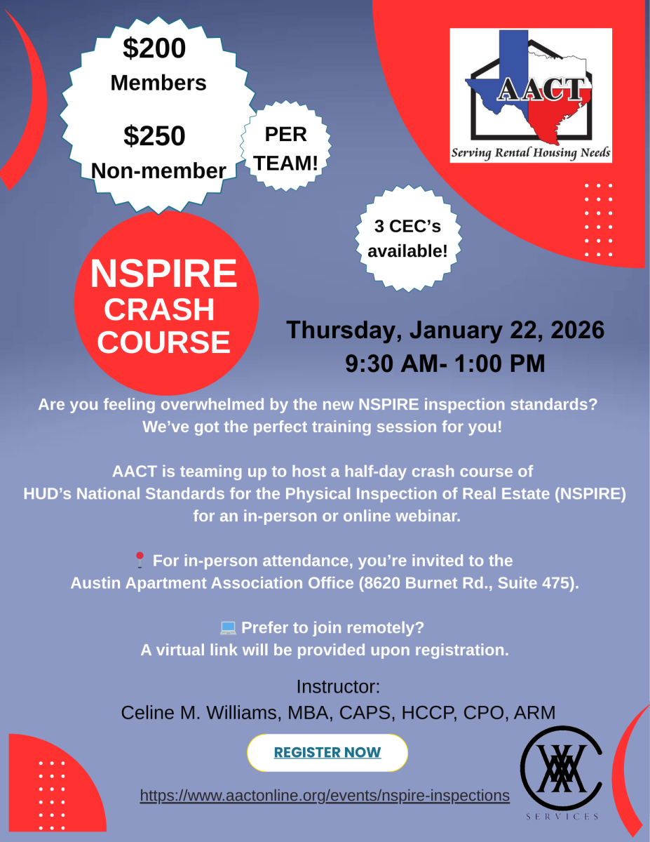 The Austin Apartment Association, Lubbock Apartment Association, and the Apartment Association of Central Texas are teaming up to offer a powerful hybrid webinar to help you confidently navigate the changes and updates to HUD’s inspection standards. This webinar is available to all members & non-members!